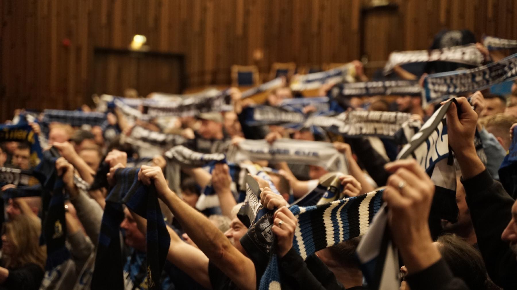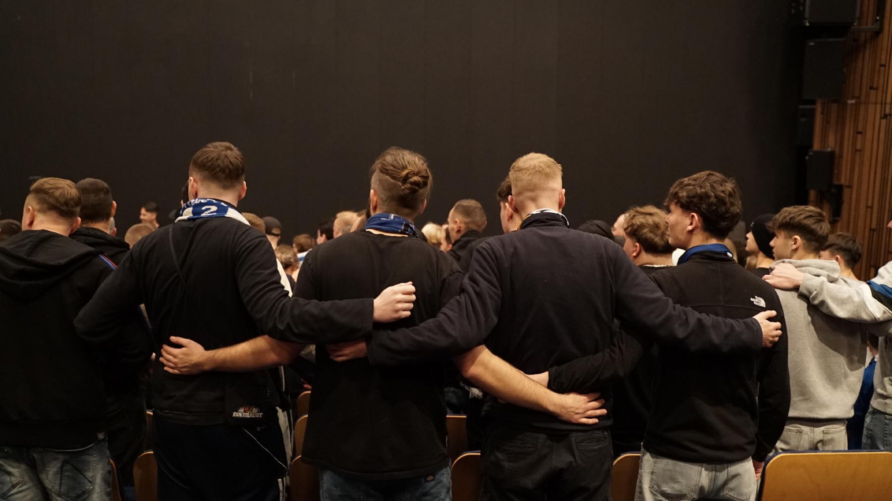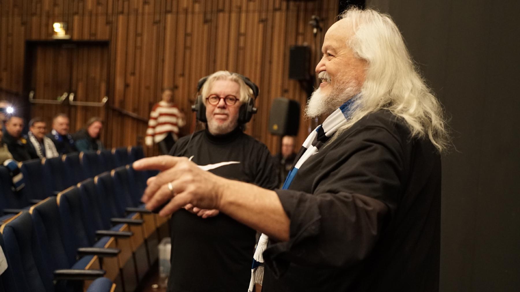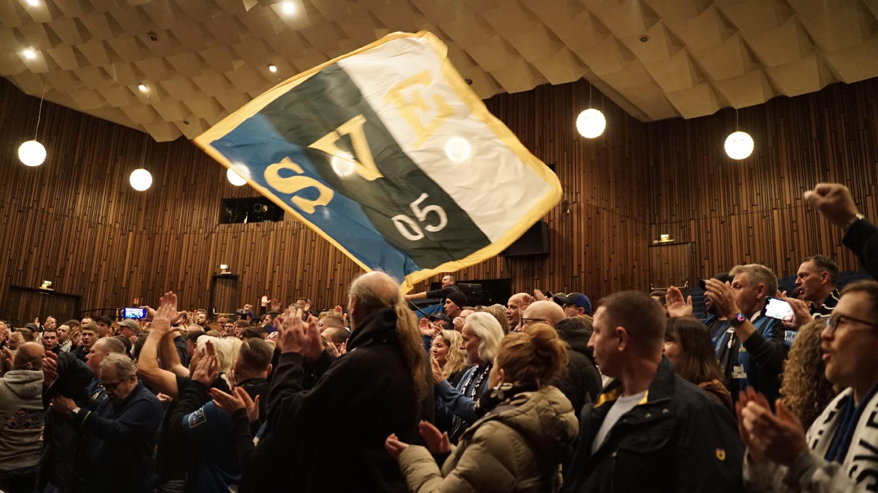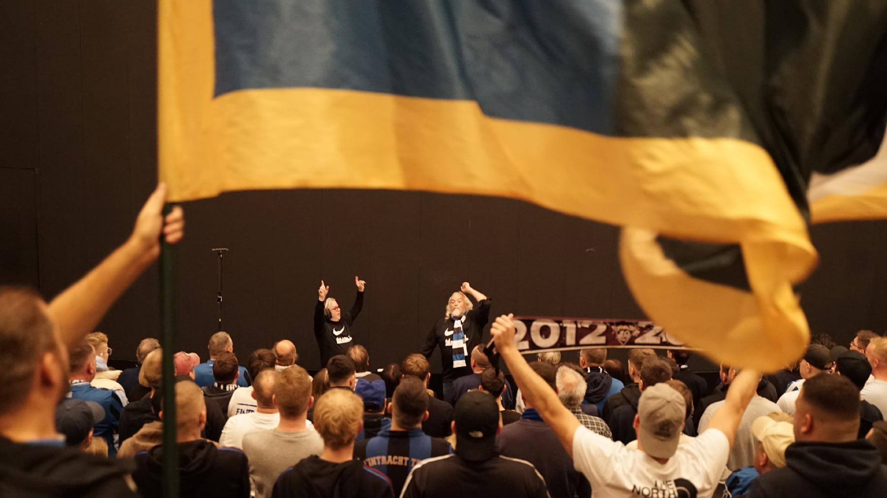 Volles Haus im Theater Trier zu einem ganz besonderen Event. Die Stimmung vor dem Anpfiff ist ausgelassen. Die über 260 angereisten Fans der Trierer Eintracht singen sich in vollem Ornat – mit Schals, Kutten, Shirts und Flaggen – warm, bevor es ernst wird. Angepfiffen wird hier aber kein Fußballspiel, sondern die Tonaufnahme der Eintracht-Hymne, die sonst aus den Kehlen tausender im Moselstadion erklingt. Geschrieben wurde die Helmut Leiendecker und seiner Bloas vor 20 Jahren. Vor 120 Jahren wurde die Eintracht gegründet. Grund genug, die Hymne auf ein neues Level zu heben. Dazu hat das Philharmonisches Orchester der Stadt Trier die symphonische Untermalung eingespielt und da darf ein ausgewachsener Fanchor nicht fehlen. Und wo ein Chor ist, da ist Martin Folz, Chordirektor am Theater Trier, nicht weit. Er leitete die Fans an, trotz allem Enthusiasmus, aller Leidenschaft, die Leiendecker als spiritus rector weiter antreibt, doch punktgenau für die Aufnahme zu singen. Am Ende fügt sich alles: Der Sound der Bloas, die Strophen von Helm, die cineastische Untermalung des Philharmoniker und der Fanchor in den Refrains, die der neuen Version der Hymne den richtigen Moselstadion-Vibe verpassen – aufgenommen im Großen Haus des Theaters Trier.