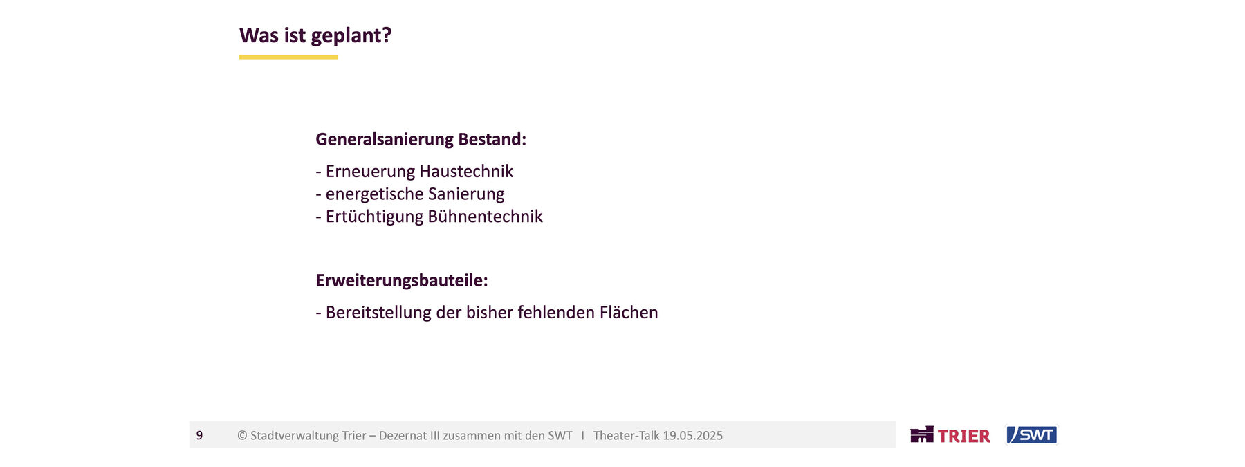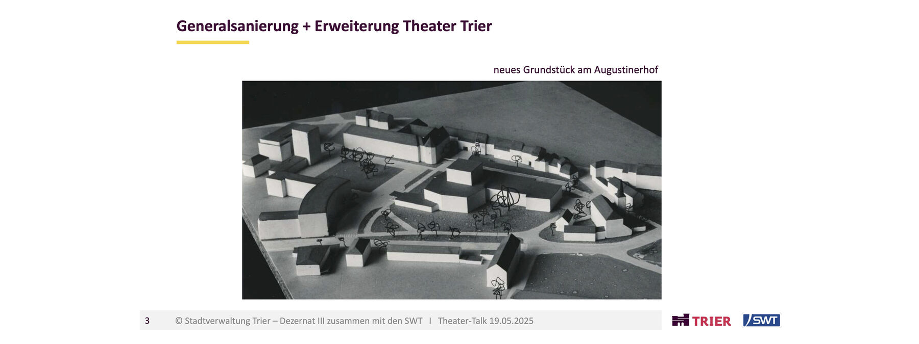 Seit über 60 Jahren steht das Stadttheater Trier am Augustinerhof. Das Haus, das jährlich von über 100.000 kulturbegeisterten Menschen aus Trier und der Region besucht wird, ist marode und muss dringend saniert werden, um auch in Zukunft den Erfordernissen an Sicherheit, Energieeffizienz und technischen Anforderungen an ein Dreispartenhaus mit Philharmonischem Orchester gerecht werden zu können.