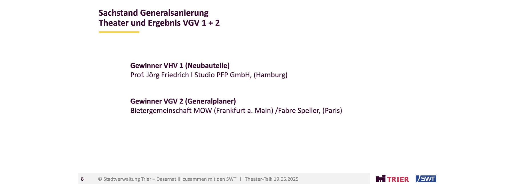 Eine Theatersanierung ist ein hochkomplexes Vorhaben. Auf Grundlage zweier Vergabeverfahren mit Wettbewerb wurden je ein Büro für die Generalsanierung und eines für die Neubauteile gefunden. Beides nach strengen, öffentlich transparent einsehbaren Kriterien. Der Gesetzgeber schreibt aufgrund der Auftragshöhen europaweite Ausschreibungen vor.