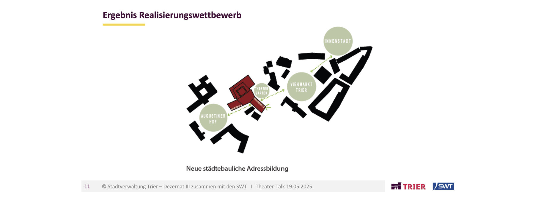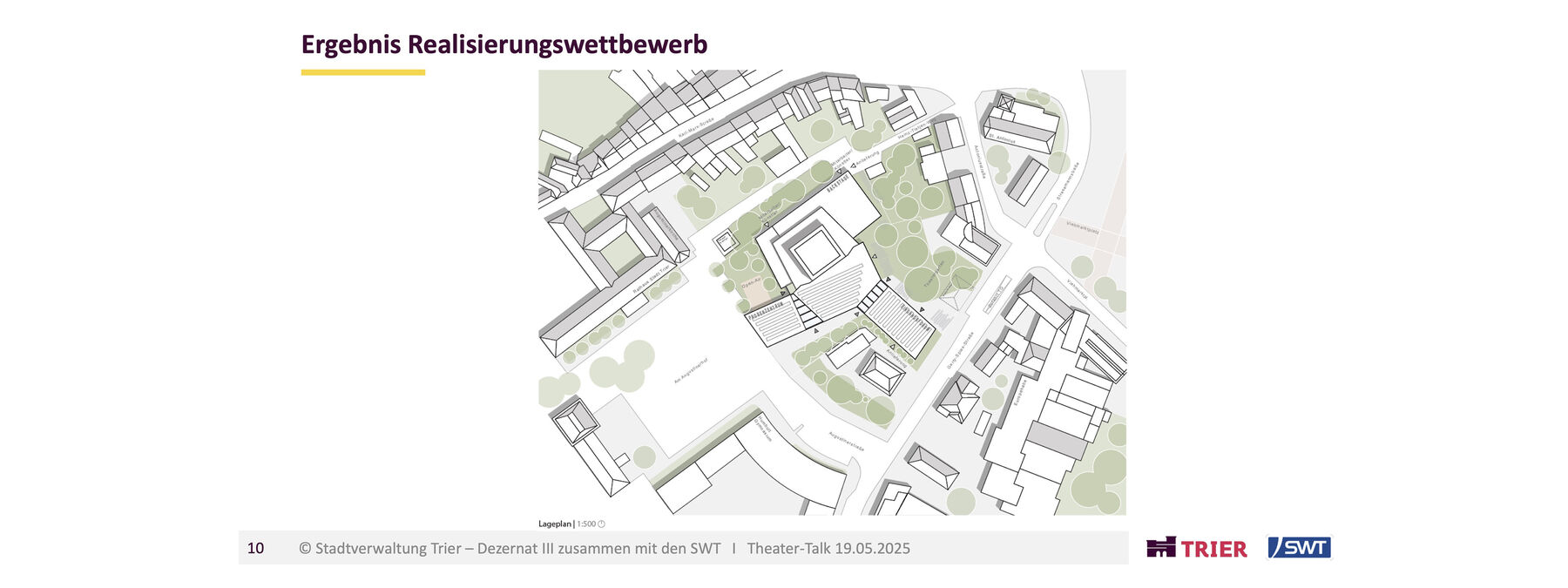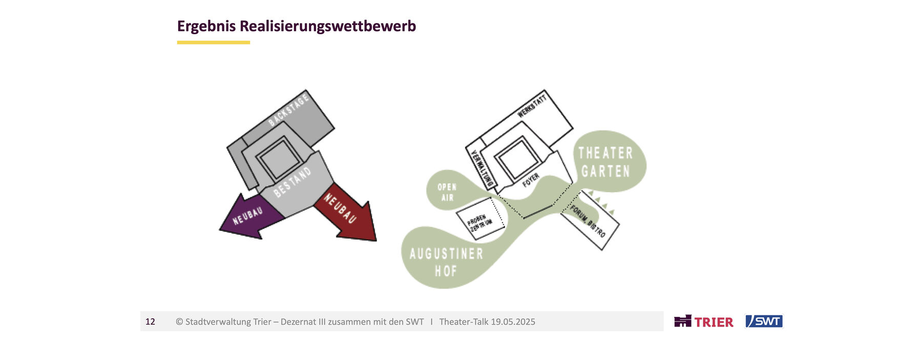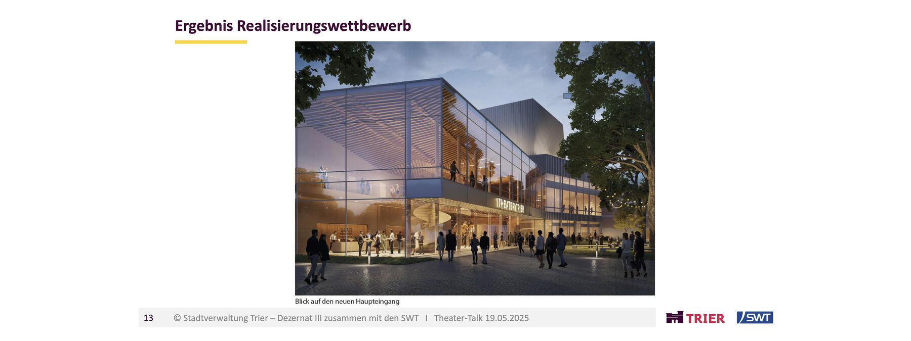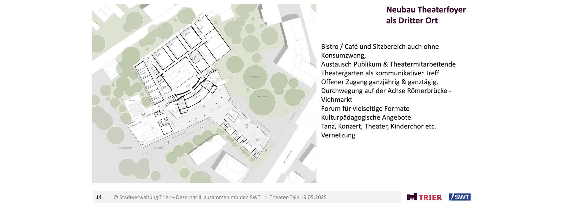 Die Generalsanierung bietet dabei die Möglichkeit, die architektonische Idee des Architekten Gerhard Graubner behutsam zu modernisieren, indem sich das Theater Trier mit seinem Gebäude weiter zur Stadt hin öffnet. Als ‚Dritter Ort‘ soll das neue Foyer die Menschen in Trier auch abseits der Vorstellungen zum Schauen, Verweilen und Durchqueren einladen. War der Bau eigentlich auf einem Grundstück an den Kaiserthermen geplant, zwangen Bodenfunde zur Alternative am Augustinerhof. Das damals zur Verfügung stehende Grundstück war allerdings zu klein, um den Entwurf Graubners komplett umzusetzen. Wichtige Räume wurden weggelassen und auch der Eingang durch eine improvisierte Kassenhalle ersetzt. So arbeitet das Theater in dieser unvollendeten, improvisierten Situation seit der Eröffnung 1964 in einem Provisorium.