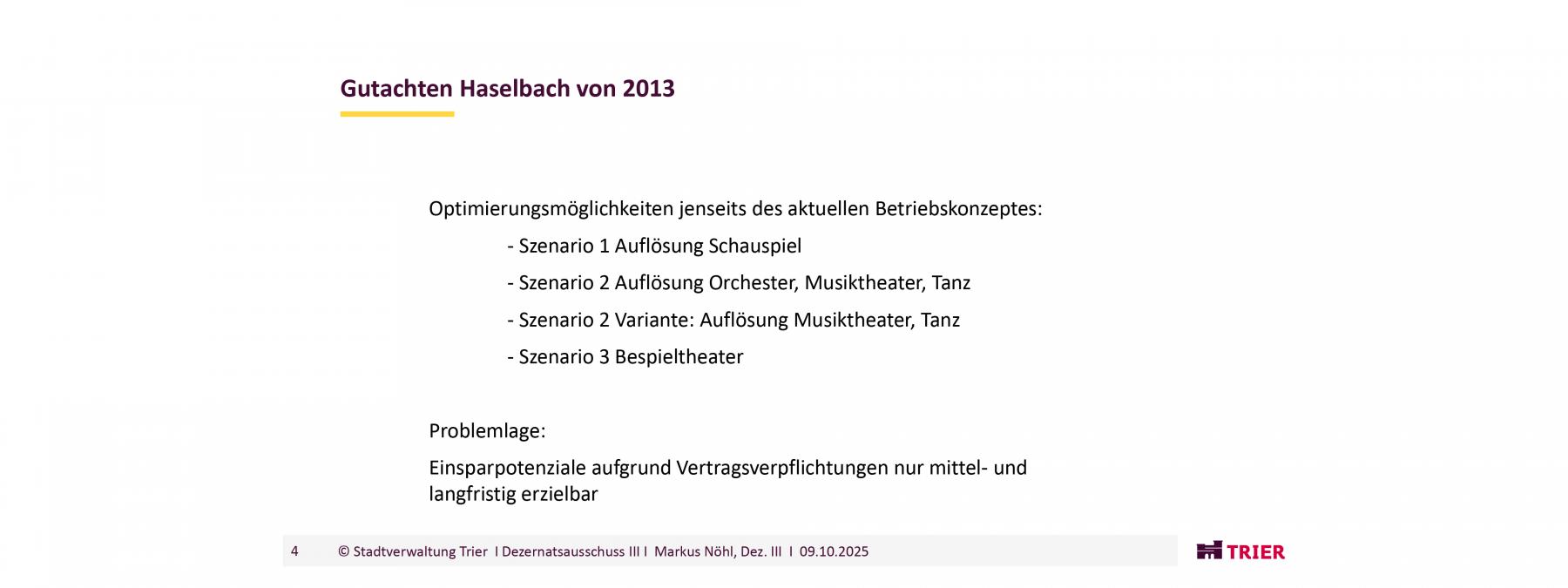 Auch für diese Bühnen müsste das Theater saniert werden. Diese Gedanken wurden vielfach berechnet. Überall zeigt sich, dass eine Zusammenlegung von Ensembles / Orchester z.B. mit Koblenz, Mainz oder Kaiserslautern teurer und ineffizienter wäre. Ein Großteil des Personals (Technik, Orchester, Verwaltung etc.) sind tarifgebundene Angestellte, die gar nicht so einfach und schnell gekündigt werden können. Ein Bespieltheater würde vom Land nicht mehr in der jetzigen Form gefördert werden. Bei Gastspielbühnen findet zudem keine persönliche Bindung, keine kulturpädagogische Bildungsarbeit und die Angebote werden nicht auf Trier zugeschnitten. Zudem liegt Trier für Tourneetheater extrem schlecht angebunden. Es wären sicher nicht die großen Bühnen wie Thalia Theater etc. die in Luxemburg gastieren, sondern kleine Tournee Ensembles. Bei diesen Gastspielbühnen fließt das Geld zudem aus der Stadt heraus, während die jetzigen Mitarbeitenden in Trier versteuern, leben und Geld ausgeben.