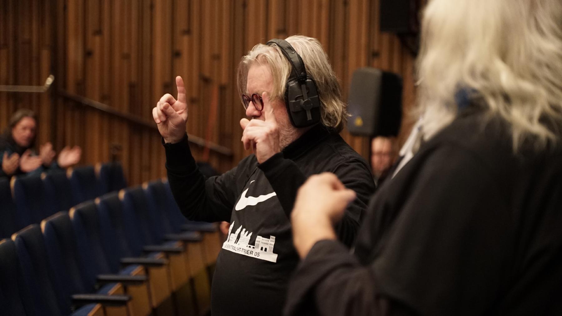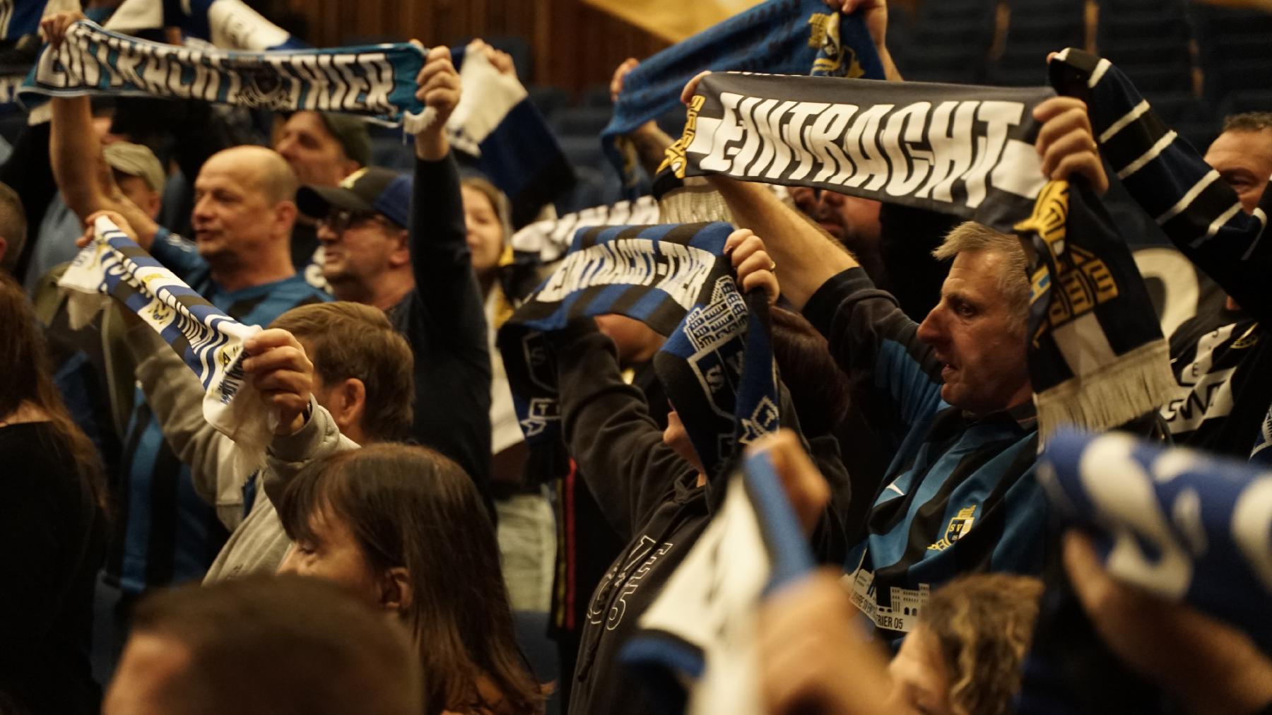 Volles Haus im Theater Trier zu einem ganz besonderen Event. Die Stimmung vor dem Anpfiff ist ausgelassen. Die über 260 angereisten Fans der Trierer Eintracht singen sich in vollem Ornat – mit Schals, Kutten, Shirts und Flaggen – warm, bevor es ernst wird. Angepfiffen wird hier aber kein Fußballspiel, sondern die Tonaufnahme der Eintracht-Hymne, die sonst aus den Kehlen tausender im Moselstadion erklingt. Geschrieben wurde die Helmut Leiendecker und seiner Bloas vor 20 Jahren. Vor 120 Jahren wurde die Eintracht gegründet. Grund genug, die Hymne auf ein neues Level zu heben. Dazu hat das Philharmonisches Orchester der Stadt Trier die symphonische Untermalung eingespielt und da darf ein ausgewachsener Fanchor nicht fehlen. Und wo ein Chor ist, da ist Martin Folz, Chordirektor am Theater Trier, nicht weit. Er leitete die Fans an, trotz allem Enthusiasmus, aller Leidenschaft, die Leiendecker als spiritus rector weiter antreibt, doch punktgenau für die Aufnahme zu singen. Am Ende fügt sich alles: Der Sound der Bloas, die Strophen von Helm, die cineastische Untermalung des Philharmoniker und der Fanchor in den Refrains, die der neuen Version der Hymne den richtigen Moselstadion-Vibe verpassen – aufgenommen im Großen Haus des Theaters Trier.